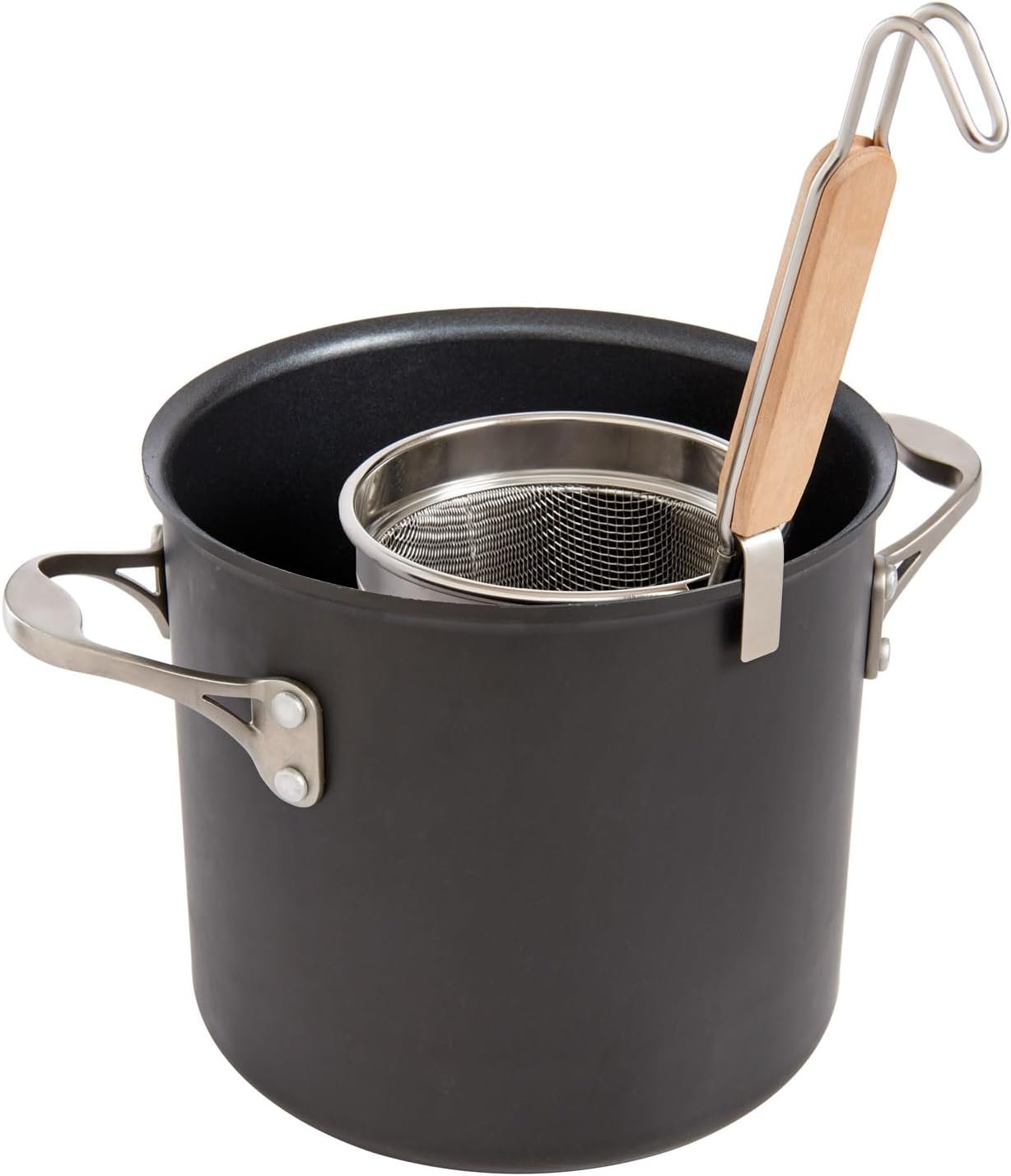 - Made from stainless steel mesh with sturdy wire frame; wooden handle with 2 hooks conveniently hangs on the pot while in use and stores away easily