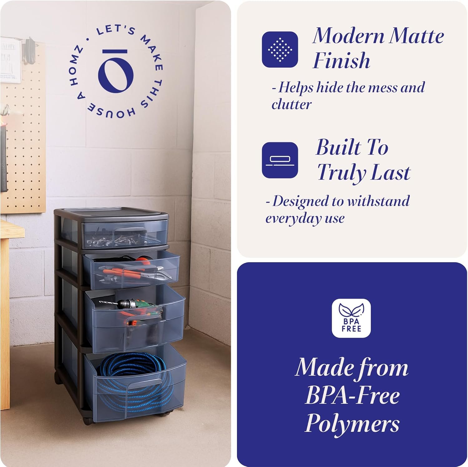 The HOMZ Drawer Tower is a versatile and durable 4-tier plastic storage organizer, featuring clear drawers for easy content visibility and 360-degree rotating wheels for effortless mobility. Proudly made from 90% recycled materials by HOMZ, it's ideal for organizing any bathroom, bedroom, office, or classroom space.