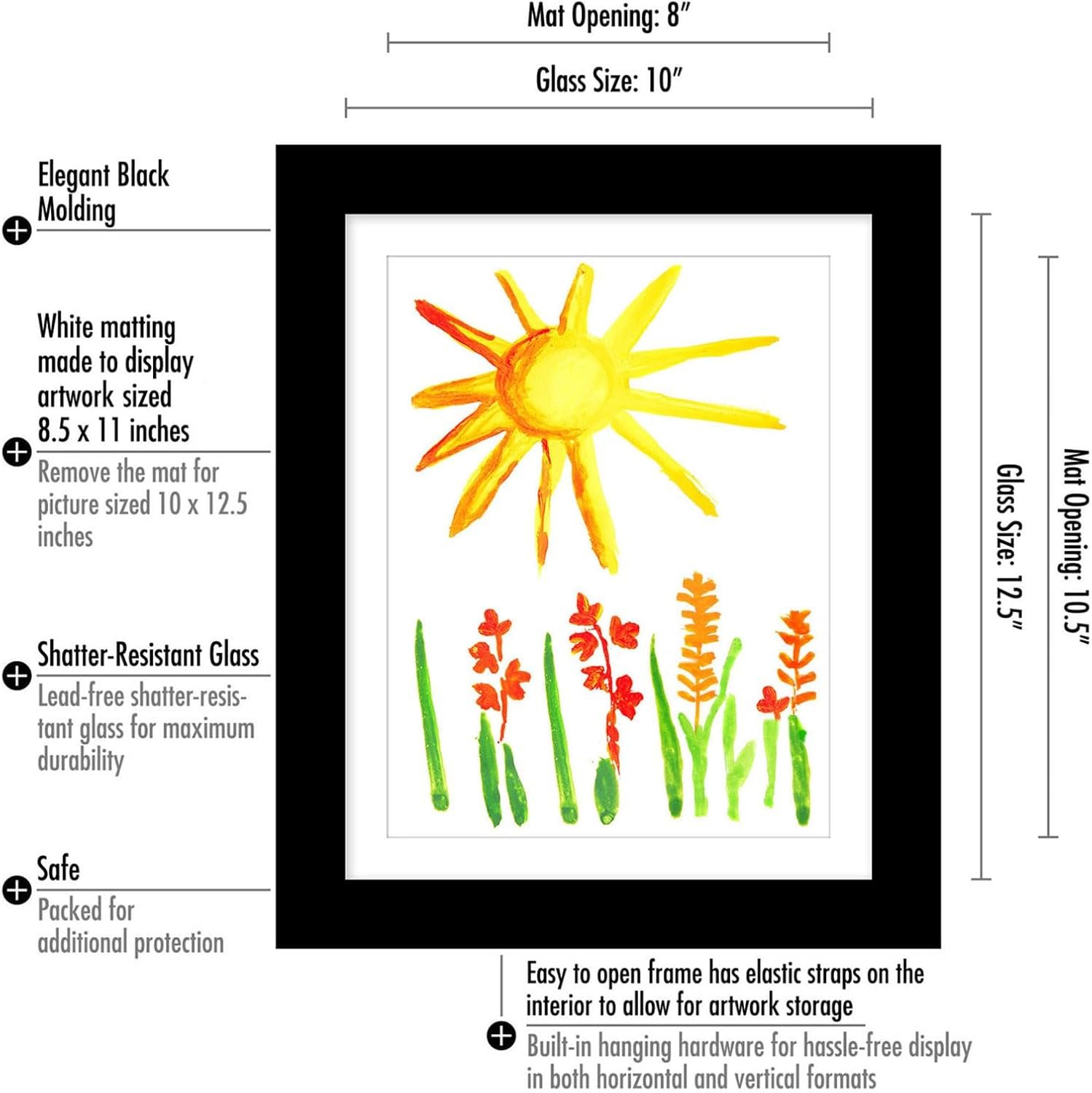 • Professional Gallery-Style Display: Each frame comes with a classic white mat that perfectly sizes the display for 8.5×11 inch paper, creating a professional art gallery frame look. For larger pieces, you can remove the mat to accommodate artwork up to 10.×12.5 inches. The sleek 2-inch molding adds a touch of sophistication that elevates crayon drawings into cherished keepsakes.