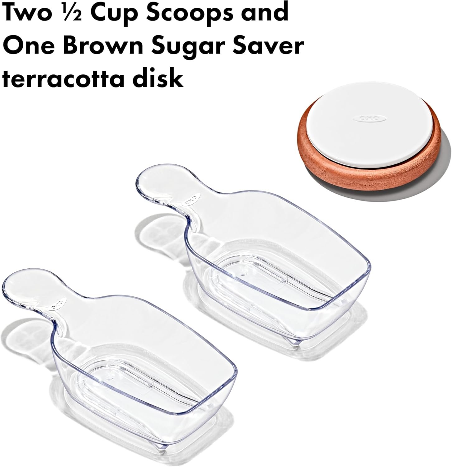 - Set includes: two ½ Cup Scoops, one Brown Sugar Saver, two 4.4 Qt/4.2 L Containers, one 1.1 Qt/1 L Container and two 0.4 Qt/0.4 L Containers