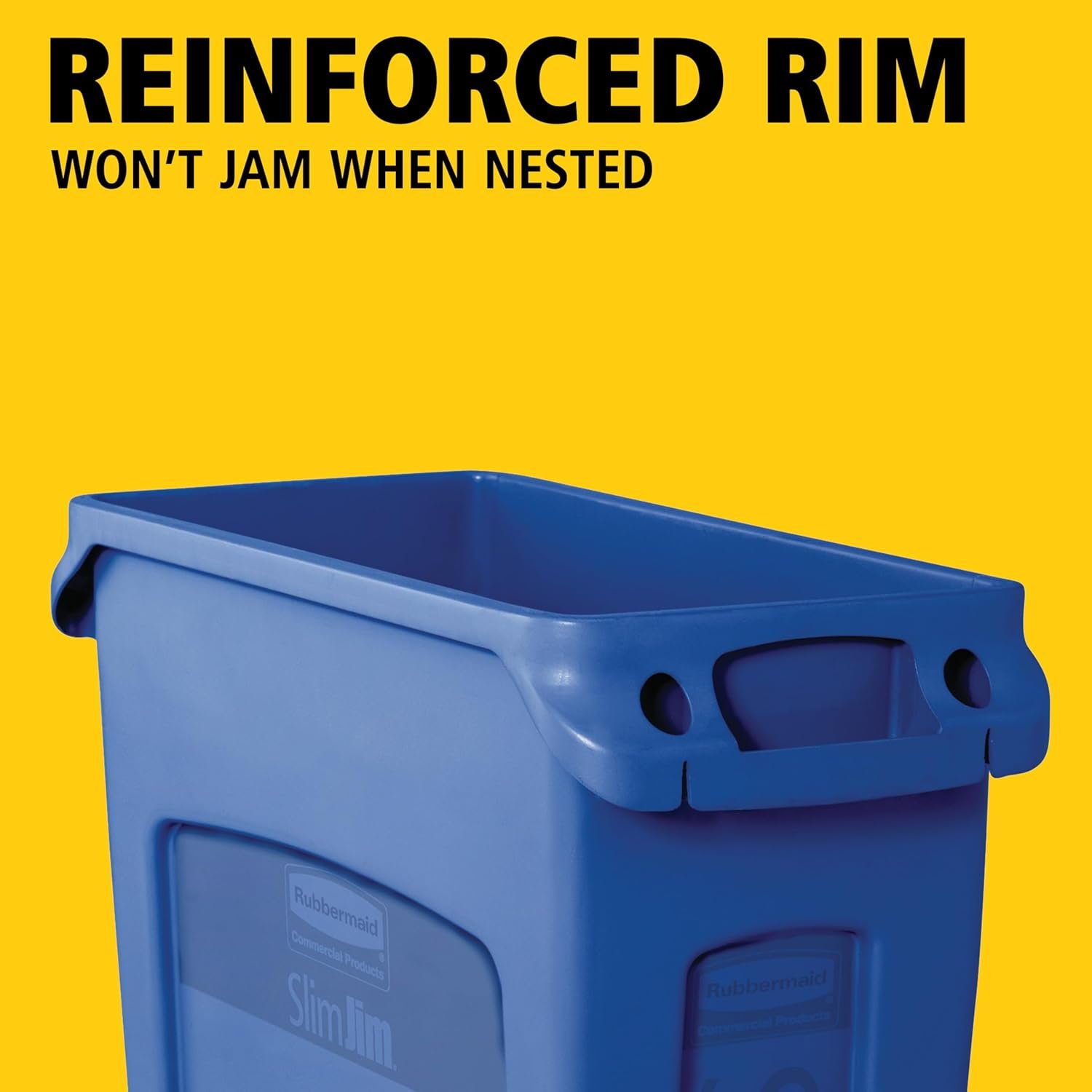 Rubbermaid Commercial Products Slim Jim Plastic Rectangular Recycling Bin is a 23-gallon, tall blue container designed for collecting recyclables in kitchens, classrooms, offices, and similar spaces. Its slim, rectangular shape fits into tight spots, making it practical for areas where floor space is limited. The venting channels ease bag removal, and the integrated bag cinches allow for secure, knot-free liner changes.