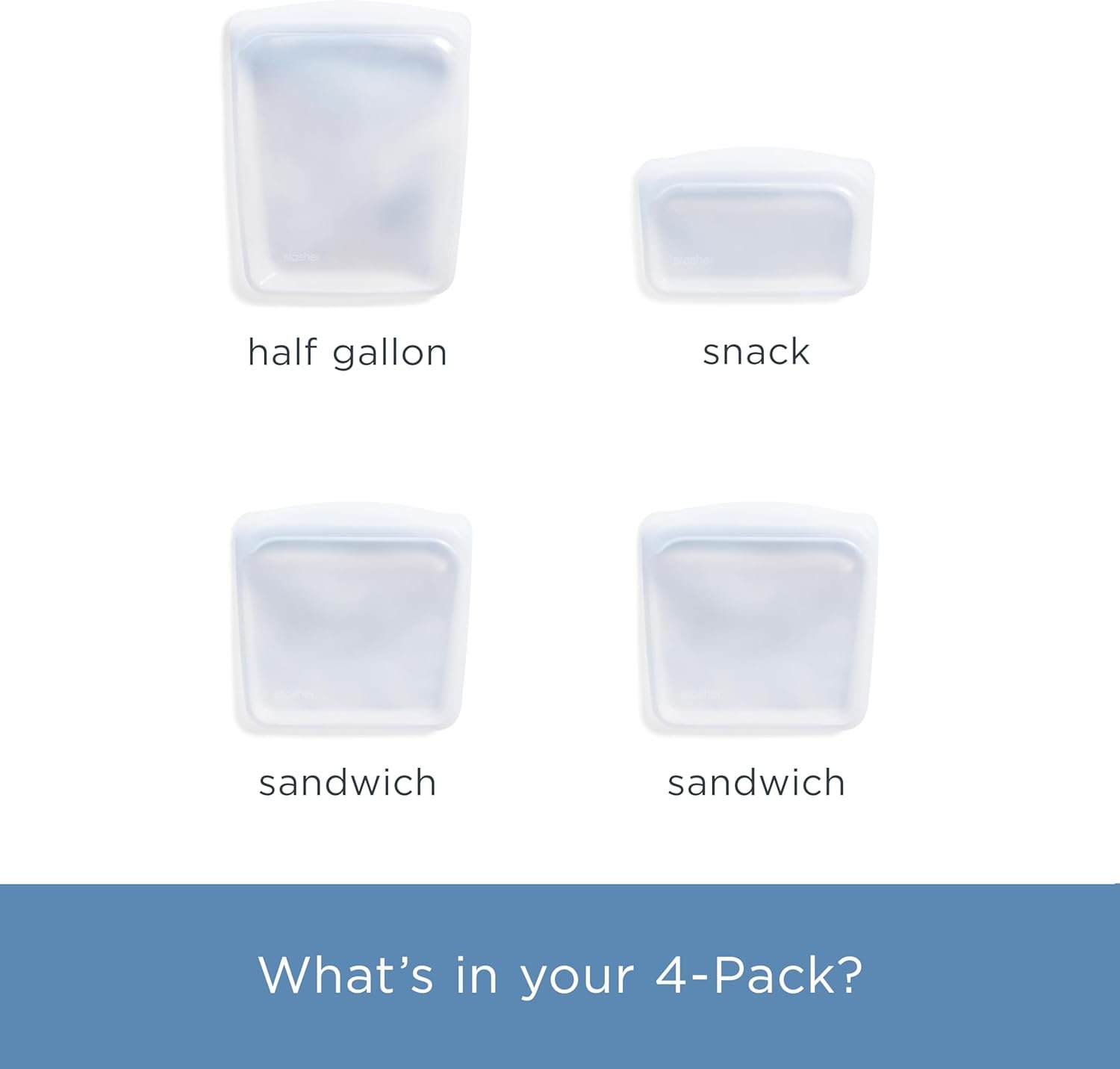 - CONTAINS: 4 Stasher Reusable Silicone Bags in the color Clear. Includes 1 Half Gallon (64 Fl Oz), 2 Sandwich (28 Fl Oz), and 1 Snack (12 Fl Oz) Bag.